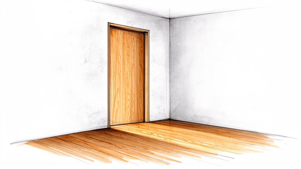 Det hele starter med en grundig opmåling. Her bruger jeg præcisionsværktøj til at kortlægge gulvets hældning og tjekke væggenes tilstand, for ja, de kan også være skæve. Den analyse er fundamentet for alt det, der følger. Derefter kommer selve tilskæringen af døren og eventuel montering af tætningslister, som er afgørende for at lukke af for lyd. Til sidst handler montagen om millimeterpræcision for at sikre, at karmen står stabilt, og døren hænger perfekt. Det er den samme omhu, jeg lægger i at bygge skræddersyede radiatorskjulere, hvor alt skal passe på millimeteren.
