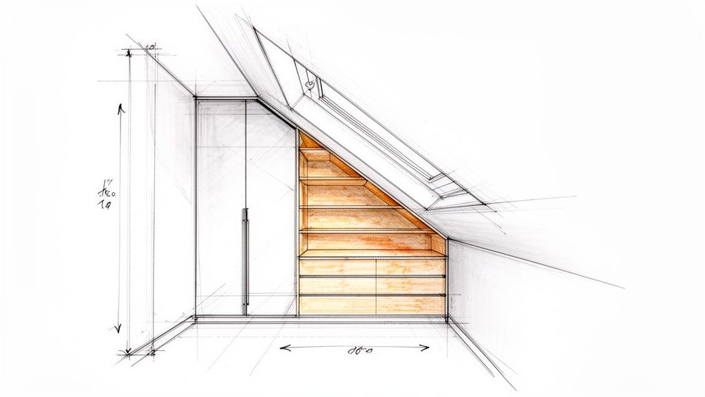 Skitse af skræddersyet indretning under skråvæg med skab, åbne hylder, skuffer, tagvindue og siddebænk.