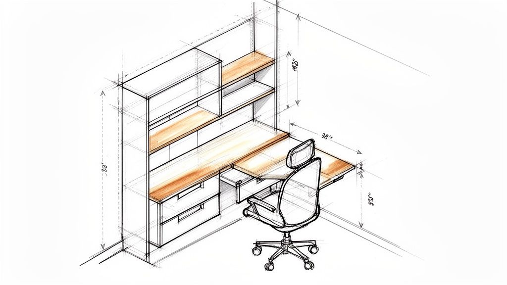 Skitse af en indbygget reol og skrivebord med laptop, stol og bøger.